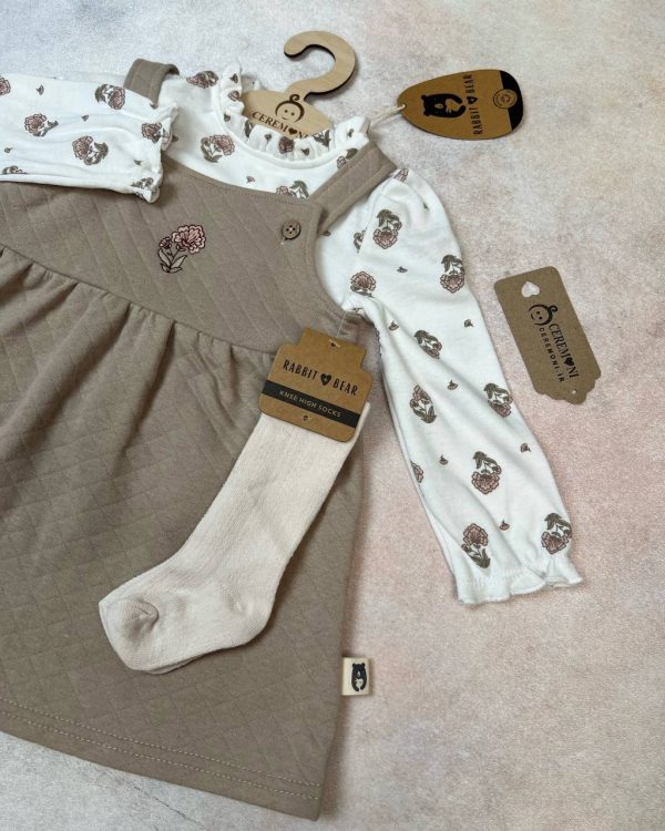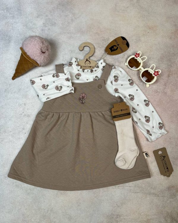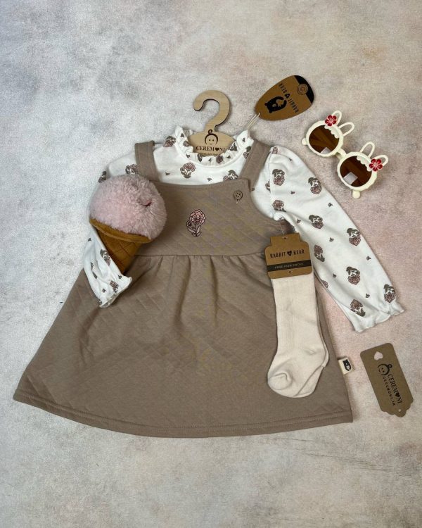 ست لباس دخترانه شامل سارفون ،بلوز و جوراب که مناسب فصل بهار و پاییز می باشد.